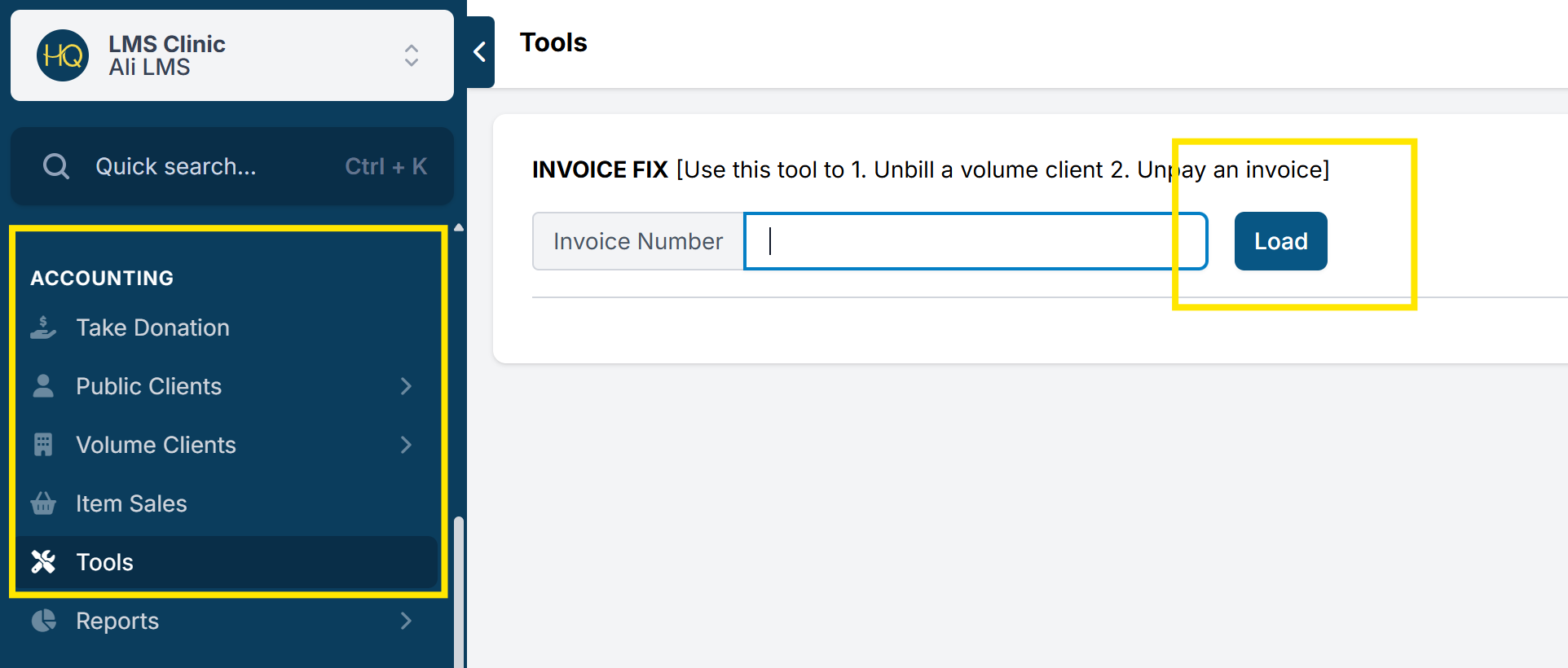 Accounting Tools consists of the ability to remove Volume Client payments and delete Volume Client invoices most commonly performed to correct mistakes with billing.