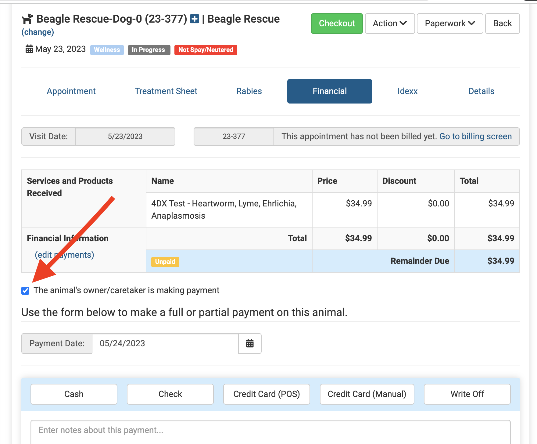 - You will see a checkbox labeled "The animal's owner/caretaker is making a payment."