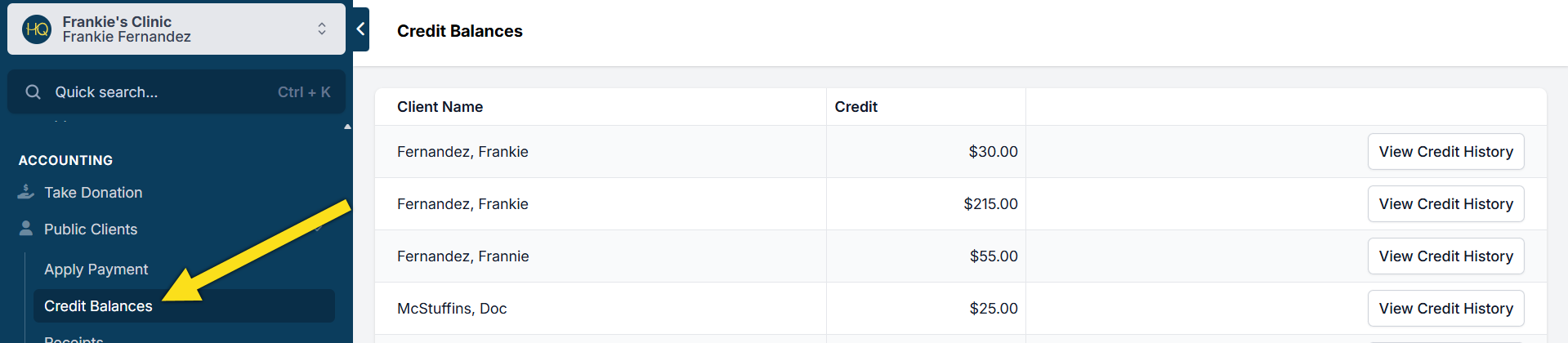 Important: Client credits CANNOT be transferred to a different client. The available credit can only be used by the original client the payment was from.