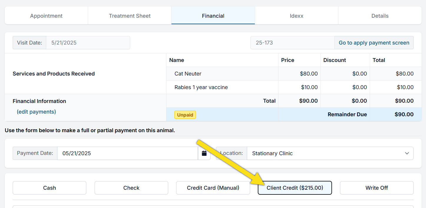 A client credit is applied like any other form of payment. If there is an available client credit, it will be displayed in the payment types alongside cash, check, and credit card. Select the client credit as the form of payment. Make Payment will draw money out of the available balance.