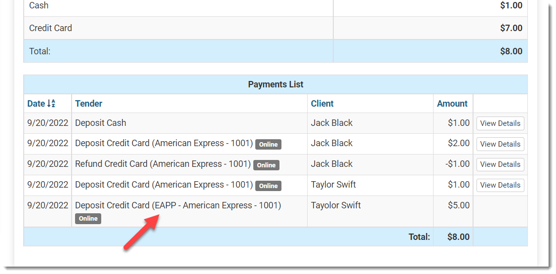 The charge is then apparent on the Reconciliation Report in Accounting. You'll notice an "EAPP" tag that lets you know it was made via an e-appointment online. You'll also notice any deposits tagged with a "Deposit" and then the tender type.
