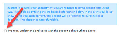 When your clients go online to make an appointment, depending on how you have it setup, they will see a screen similar to this. The language here is all editable. You'll just want to make sure if you change how much your deposits are, you reflect that in the language on the screen. This is available for editing in Settings > E-Appointments > Edit > Deposits Tab.
