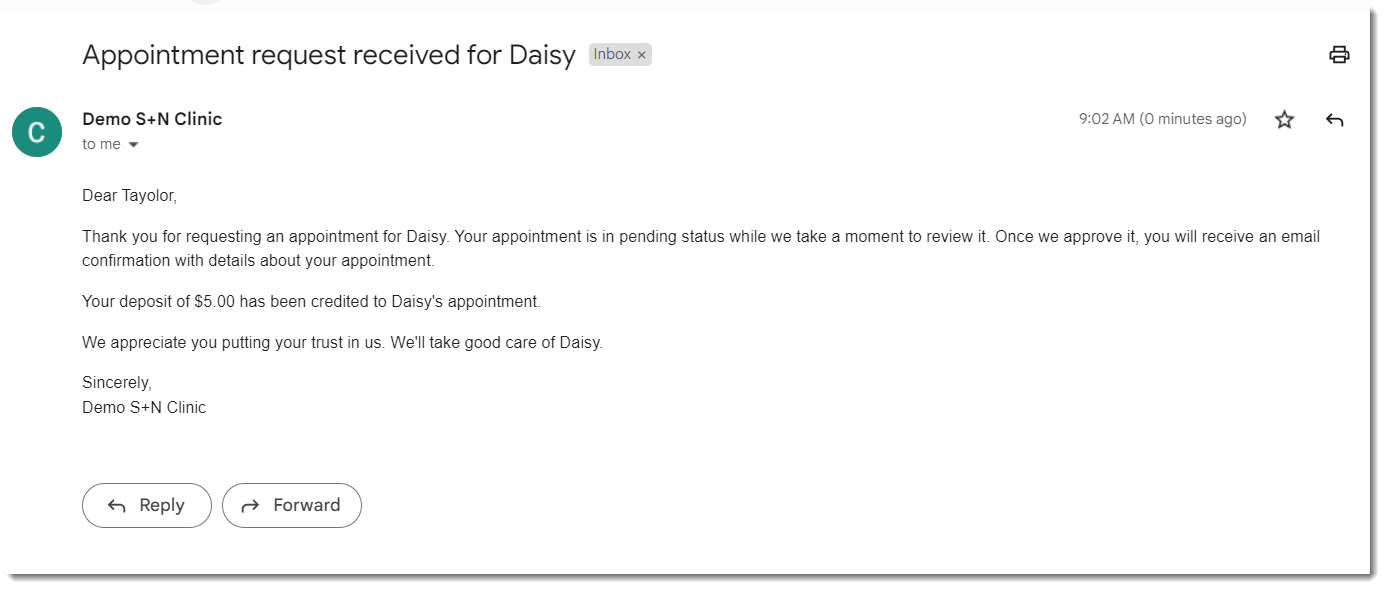As soon as the person makes the appointment online, the card is charged and a few different things happen. First, they are sent a receipt that looks like this. Note: The language is not editable for this email.