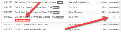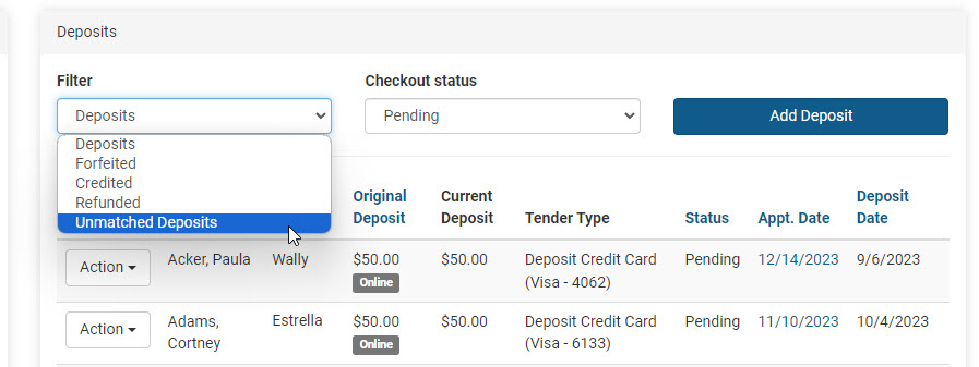 Here, use the filter dropdown menu to sort the list and display the Unmatched Deposits.