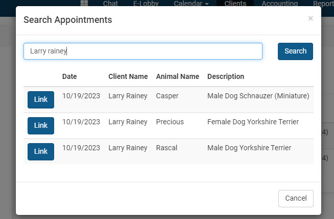 Important: this action is irreversible. Please be sure you link to the correct client/animal appointment.