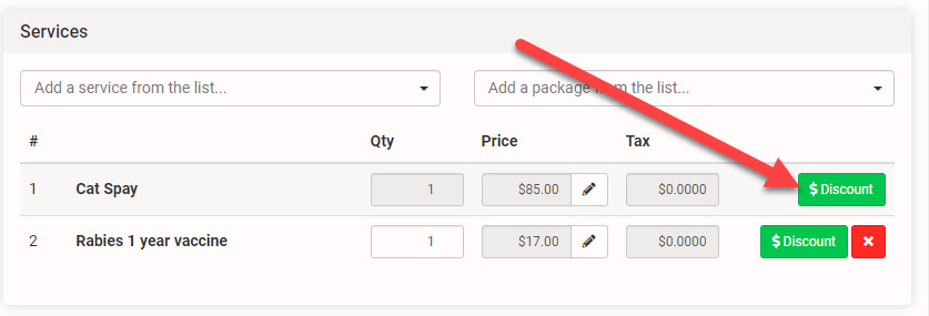 - View the services on an animal's appointment. Notice next to each line item is a green "Discount" button. The discount can be applied in nearly all places the services are listed - except when editing a pending e-appointment request.