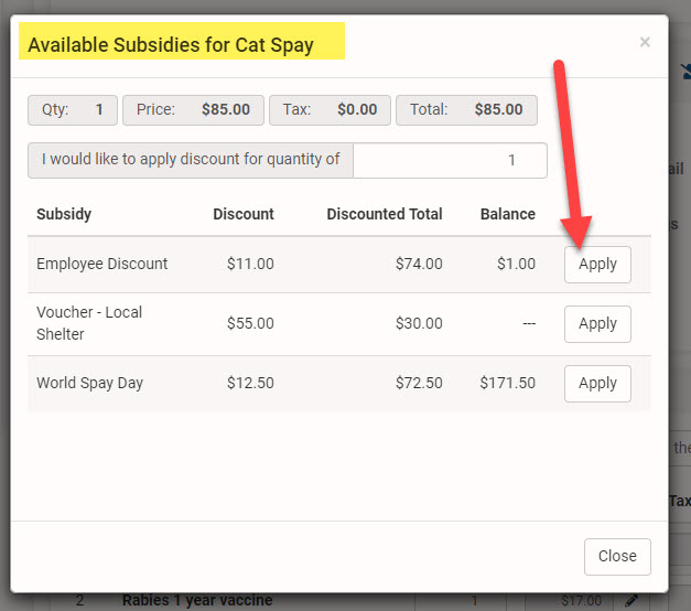 NOTE: Only one subsidy discount per line item. You cannot apply more than one subsidy to a line item. If your clinic needs to discount a service using more than one subsidy, read about how to set that up_ (blank)HERE.