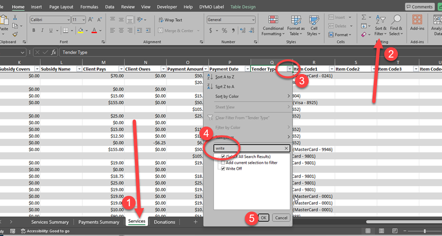 #1 Go to Accounting > Financial Export #2 Choose the report type: Appointment Date #3 Select the date range to search results for. #4 Export the report to an Excel spreadsheet so the data can be manipulated further. #5 Once opened, go to the sheet labeled "Services." #6 On the Excel toolbar locate the button "Sort & Filter" and apply a Filter to the report. This will produce down arrows along the column headers. #7 Locate the column labeled Tender Type and click, the down arrow. #8 Use the search bar on this menu to filter out "Write Offs" You will need to type in these words and then click OK to view the resulting appointment details where a write-off was used.