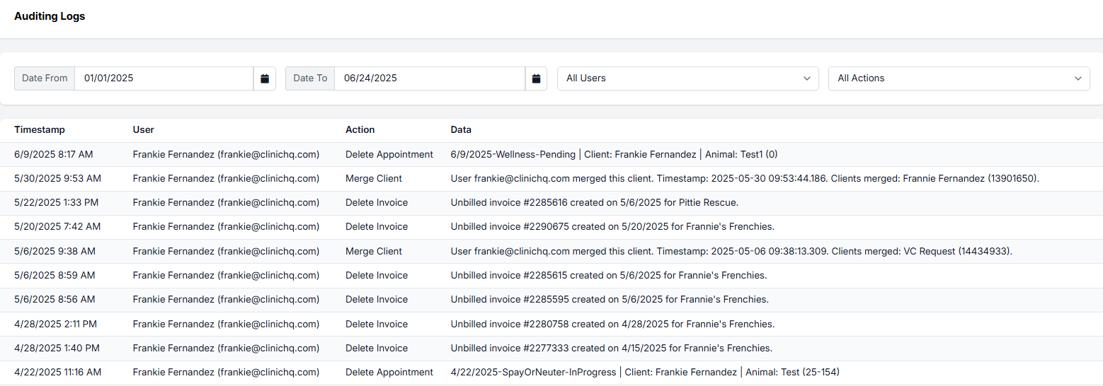 - You can filter by date, user, and type of action. Actions include deleting appointments, invoices, and drug bottles, merging clients or animals, and editing your HQ subscription.