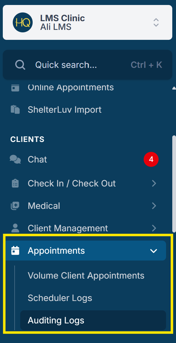 - The auditing logs keep record of important, typically irreversible actions that have been made in HQ. To find it, go to Clients > Appointments > Auditing Logs.