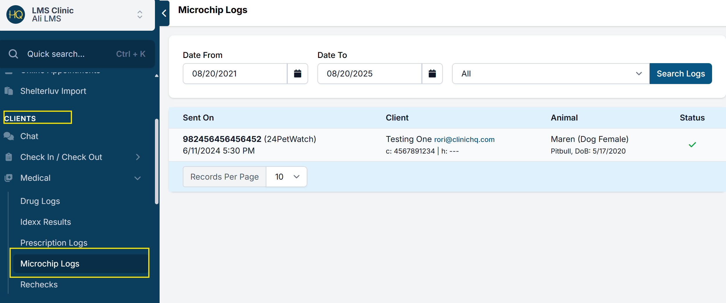 You can also view the status of registration for all microchips via the Microchip Log located in Clients > Medical > Microchip Log.