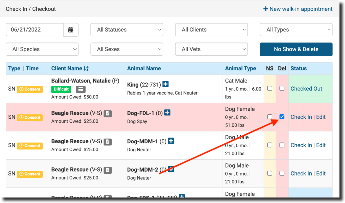 ❌ Important: If the animal has no history with your clinic and their appointment is deleted, the animal will also be erased from the client profile.