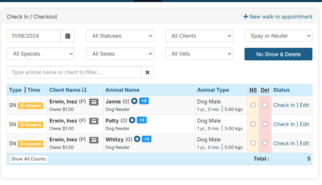 Sometimes a Volume Client (e.g., a rescue group) may book multiple appointments online using the public client form. These can be converted into Volume Client appointments by merging records.