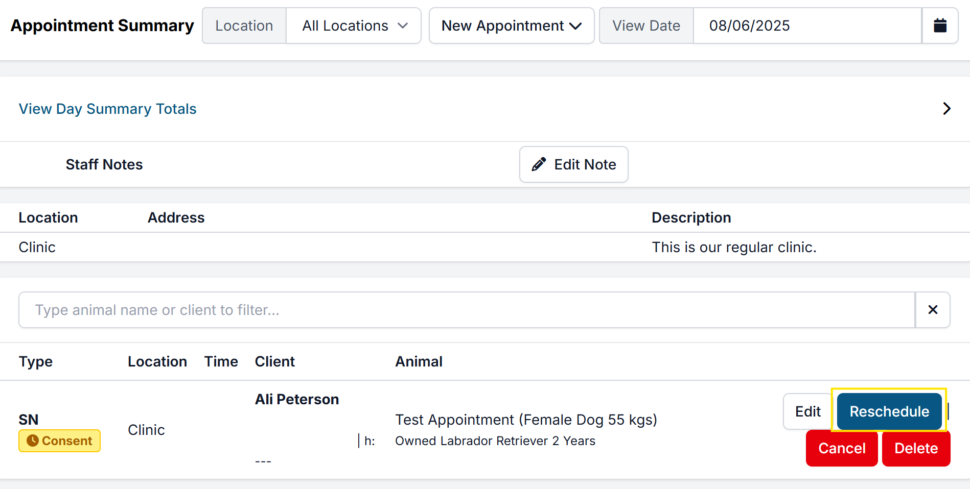 - For each appointment, click Reschedule and move it to the new date.