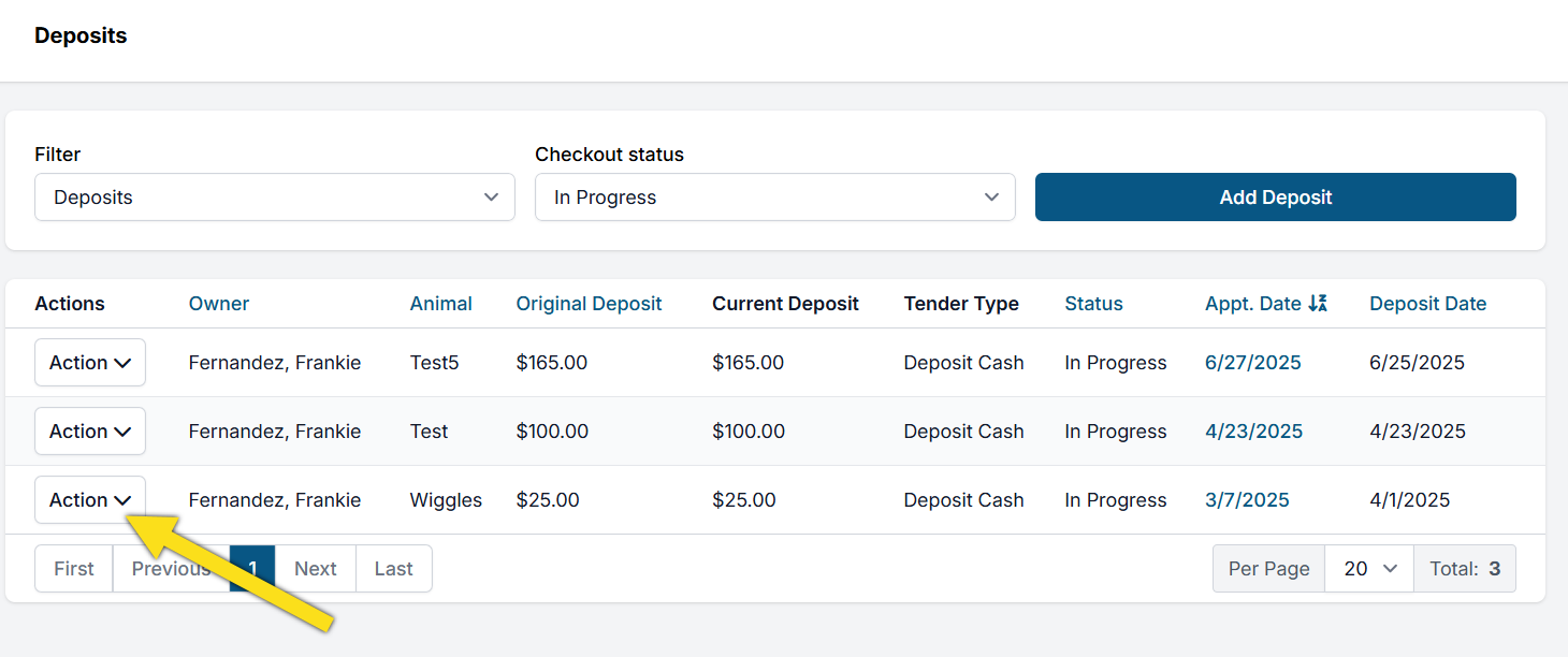 - Locate the deposit using column sorting options such as Last Name or Appointment Date.