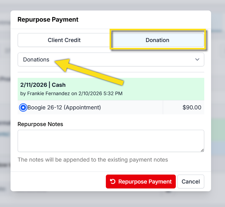 When a deposit is repurposed, the funds are no longer applied toward services or products for an appointment. Instead, the deposit is forfeited and converted into a donation.