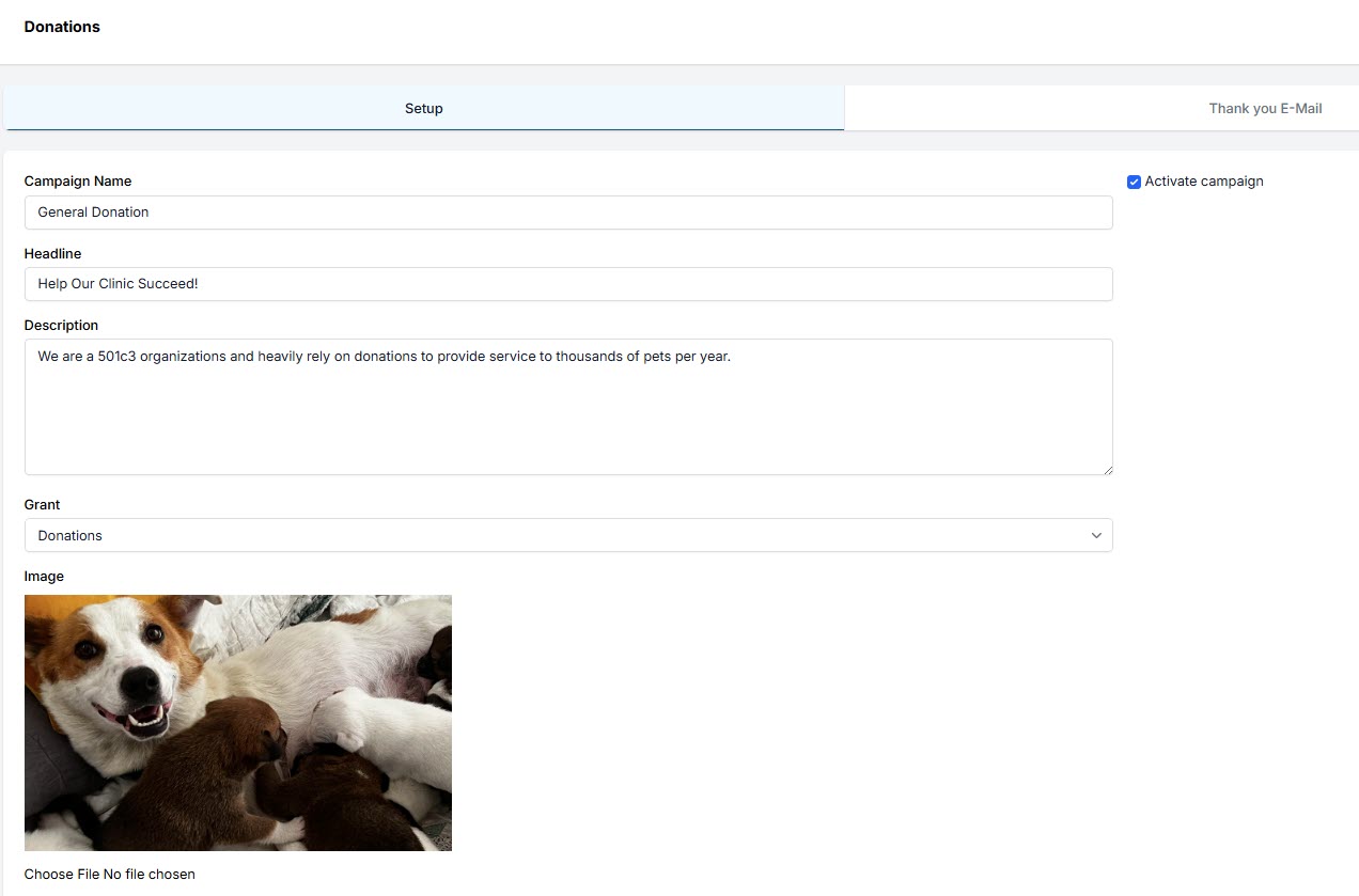 First it's important to understand you can have separate donation campaigns to raise money for various things. To start with you can set up a General Donation campaign. However, at some point, you may want to do a targeted donation campaign. Let's say you wanted to raise money for a new autoclave, or to hire a new vet. To do this -- and have a seperate special link just for this type of campaign -- you'd set up a new campaign just for this special project.