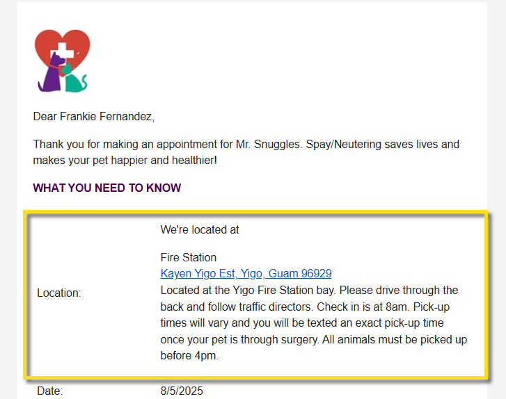 When setting up communications, ensure you only use the available placeholders. For example, if the client type is Volume Client (VC), you’ll see Animal Number instead of Animal Name. This will generate messages like, “Your rescue is scheduled for 6 animals on 10/31/24." The VC can review the specific animal names in their Portal.