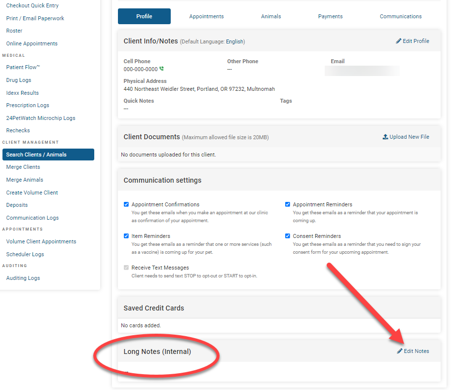 For Public and Volume Clients, we have the "Long Notes" internal section where you can stash a note about a client communication. Search the client and open their profile.