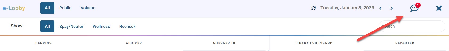- By default, the page will open to “today.” Use the arrows in the upper right corner to view clients scheduled in the future. Each animal will have its own card. On the card is a chat bubble icon.