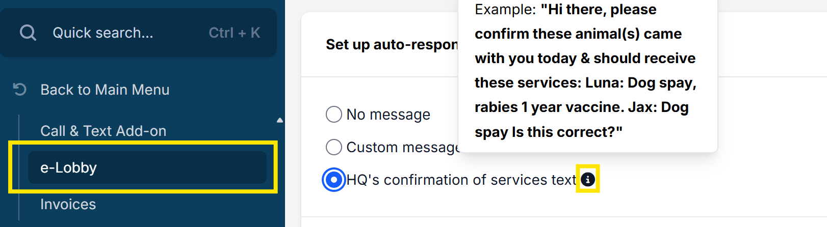 When a client texts you to this number and they have an appointment on the same day, HQ can help you begin the check in process. It will auto-respond confirming the owner brought all the animals they were scheduled for, and also, it will confirm the services each animal is supposed to get. You enabled this in Settings > E-Lobby and here's how it reads: