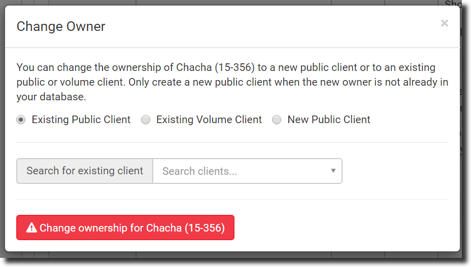 The change owner tool is used when an animal once belonging to one person now belongs to another.
