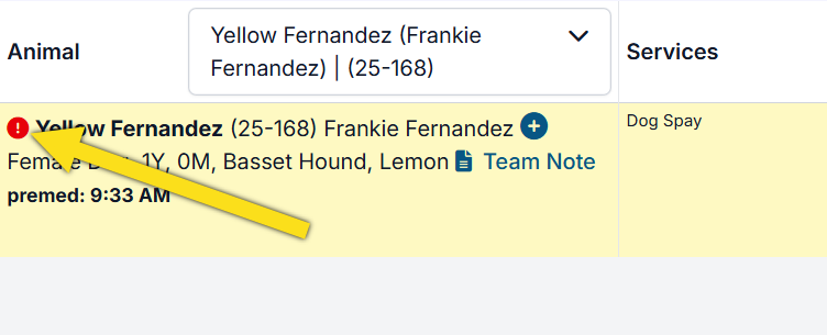 Throughout the system next to the animal's name will be a red exclamation mark - this is the indicator the animal has been marked with Caution.