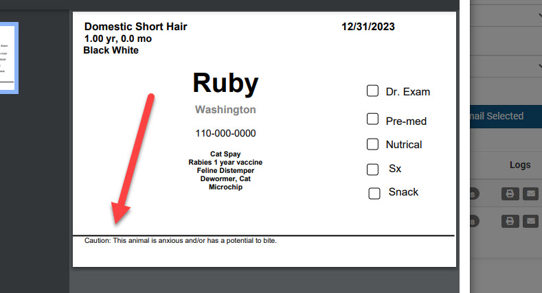 The caution blurb cannot be customized. "Caution: This animal is anxious and/or has a potential to bite." This note appears on the Roster, animal information, and anywhere the animal quick notes merge field has been added in custom templates.
