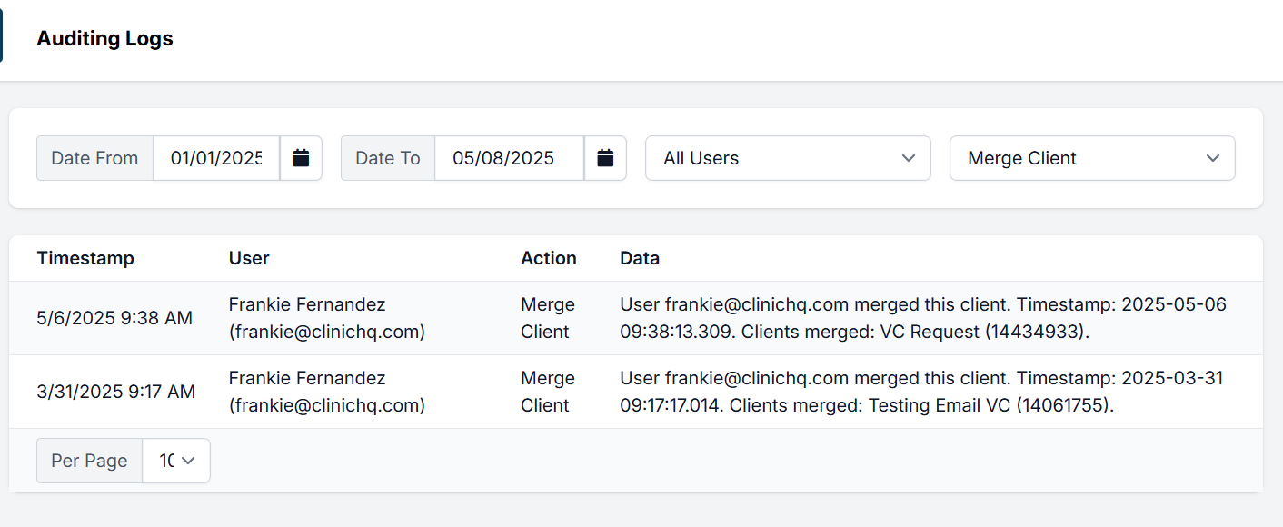 - The user who merged the information is indicated in the Audit Log, it tells you what time the merge was completed and gives you the names of the clients that were merged. This is all the information that’s available in the system anywhere about this procedure.