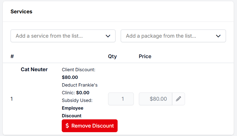 - Example: If Cat Spay is $55 and the employee discount is 20 percent, enter a client discount of $11. Percentage-based discounts must be manually calculated for each service. Automated percentage discounts are not currently supported.