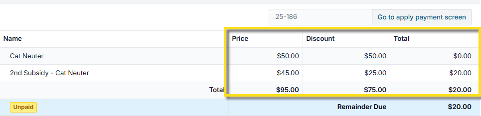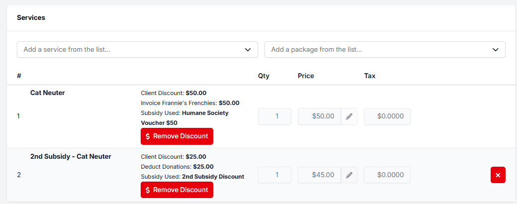 - Apply the first subsidy to the surgery line item, such as Cat Neuter.