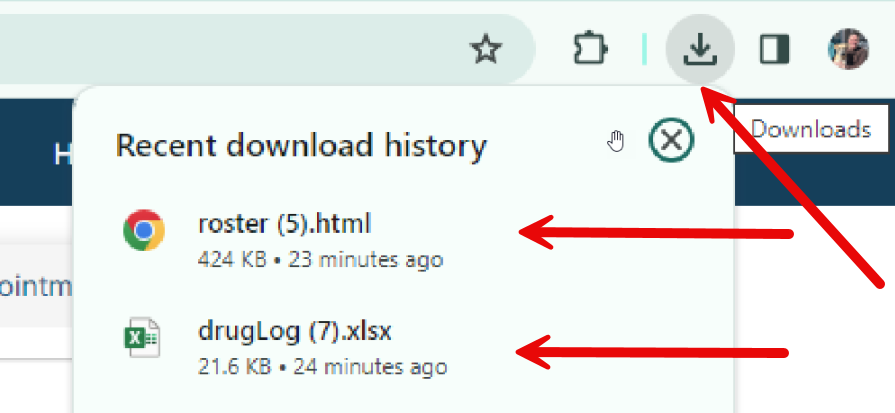 Once you click on 'Drug Log' or 'Roster', they will populate in the downloads section of your browser: