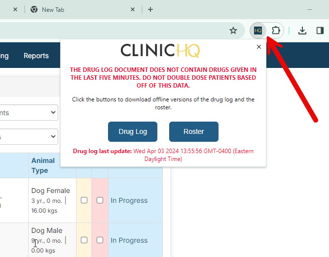 Our Chrome Extension is a storage center of your Drug Log and Roster in case Clinic HQ goes down. Both the drug log and roster are backed up every five minutes. If Clinic HQ goes down, you can click the extension in the Chrome browser and produce a copy of your drug log and your roster. The Chrome extension will work even if Clinic HQ is offline! The Vault Extension stores local history, keeping these files inside your browser which significantly minimizes security risk.