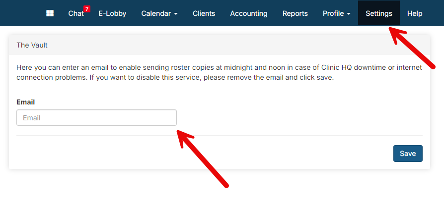 You can also have your roster emailed to you at midnight and noon in case Clinic HQ goes down or there are internet connection issues. Go to Settings>The Vault>Add your email in the textbox provided.