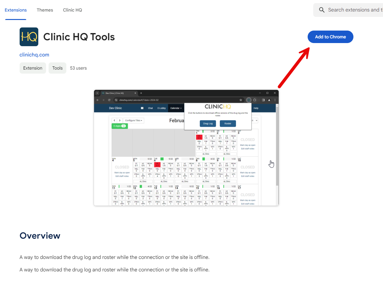 To download the extension, click Here and select 'Add to Chrome.' If you have Clinic HQ open when you install the extension, please be sure to REFRESH Clinic HQ for the extension to take effect!