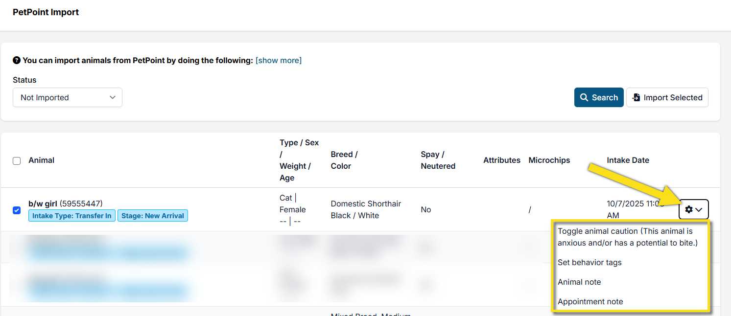 At the time of importing, you can assign behavior tags, mark caution, and add animal/appointment notes. To do so, click the gear icon next to the animal, then click the corresponding action.