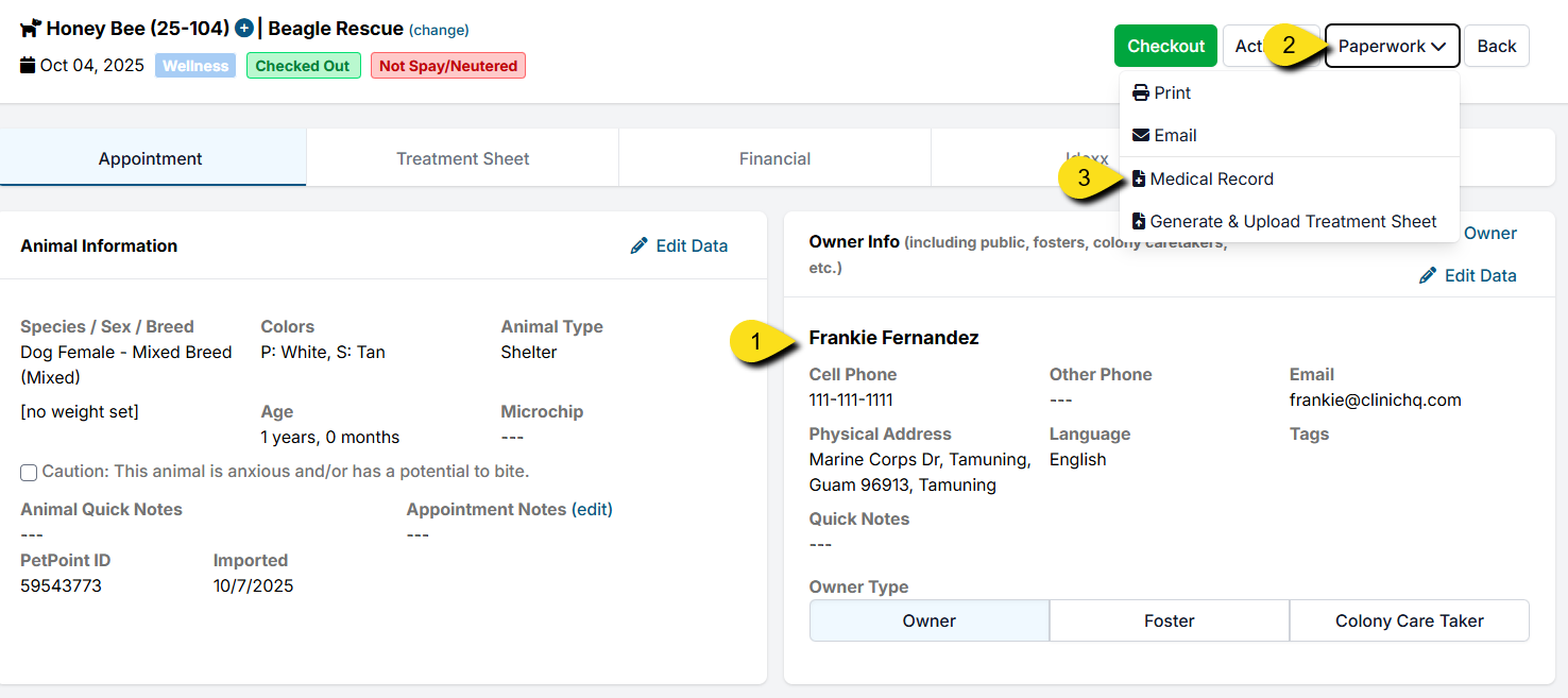 Once the pet is adopted, you can assign an owner and send their medical record. To do so, find the animal's last appointment (you can use quick search to find them).