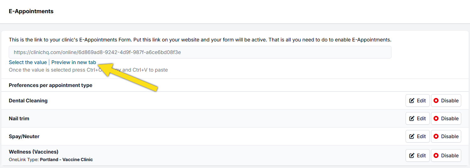 - To view your active scheduler link, click Preview in New Tab. This will open a new tab where you can see the scheduler from the client’s perspective based on the appointment types you have customized for your clinic.