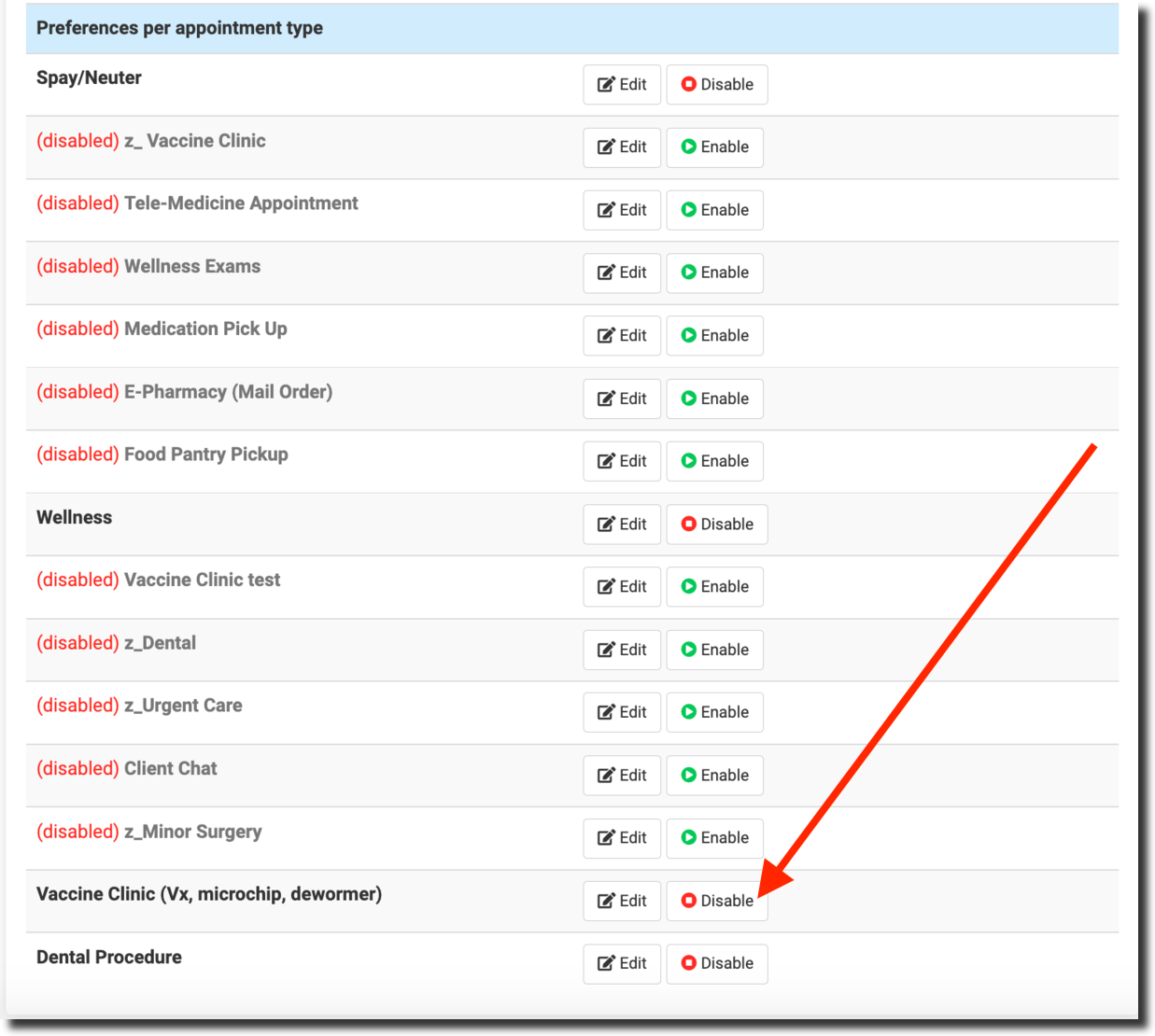 - Ensure the Vaccine Clinic appointment type is created and enabled.