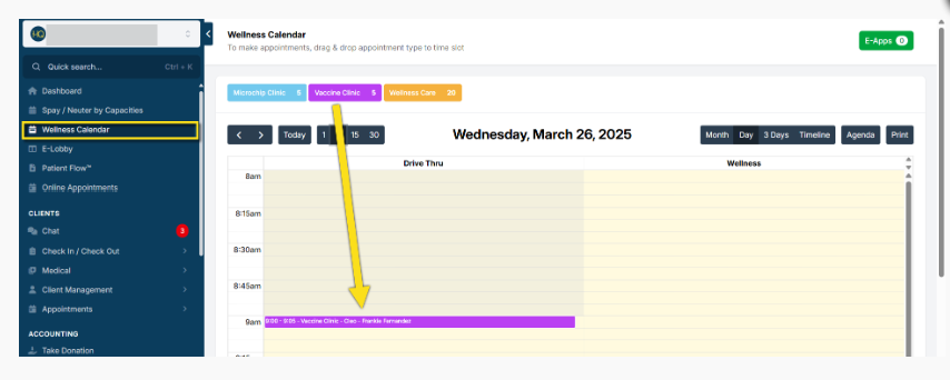 ✅ Pro Tip: Use the Advanced Wellness Calendar for vaccine clinics. Assign short time slots per animal to reduce crowding and wait times.