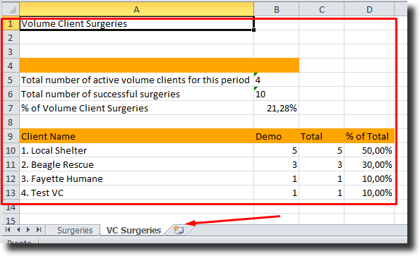 The second sheet shows some information about Volume Clients surgeries, like the total number of active clients, and also detailed information on how many surgeries each volume client had during that period.