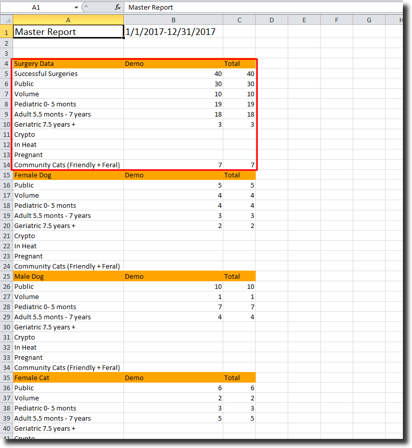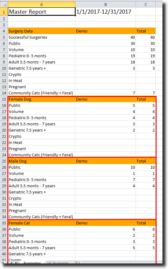 The first funders are looking for grouping. In particular, that means a surgeries count, a public and volume surgeries count, the age counts (Pediatric, Adult, and Geriatric), as well as other indicators like Cryptorchids, In Heat, Pregnant, and Community Cats.