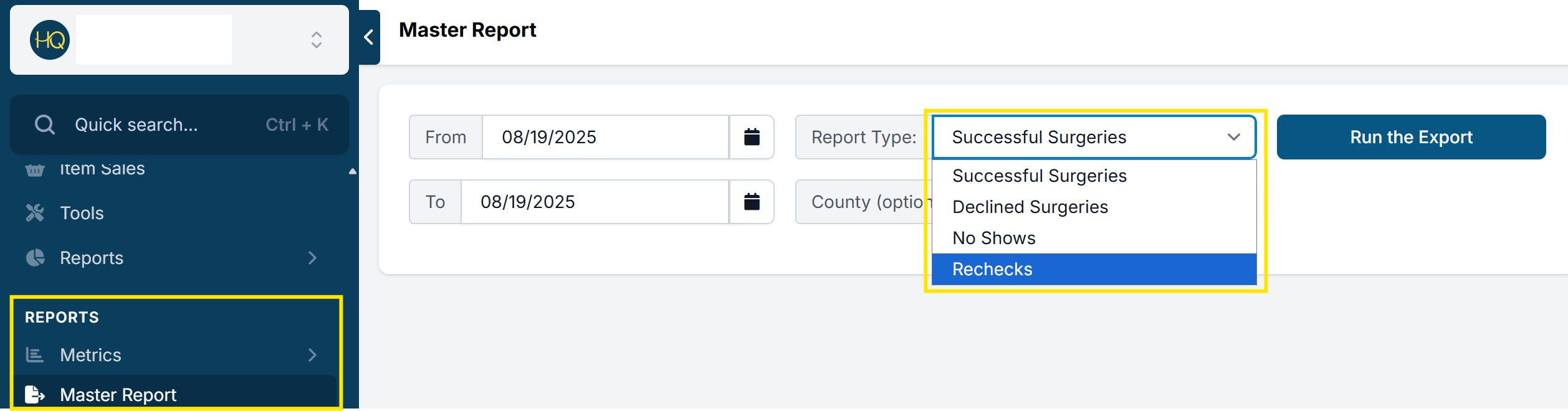 This report gives your clinic important data on the results of your surgeries.To enter the Master report, navigate to Reports and select Master Report.