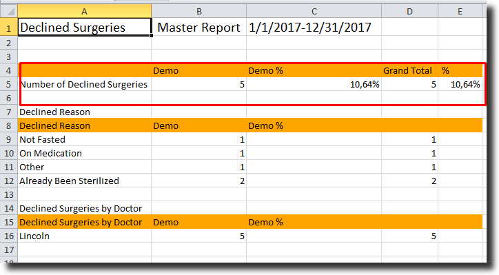 The first grouping of this report is the total count of declined surgeries. You can see the total, and the percentage it represents, of your total surgeries during that date range. The second grouping is the count of each reason for the denial of surgery. The third grouping will include vets, and the count of declined surgeries for each vet, in that period of time.