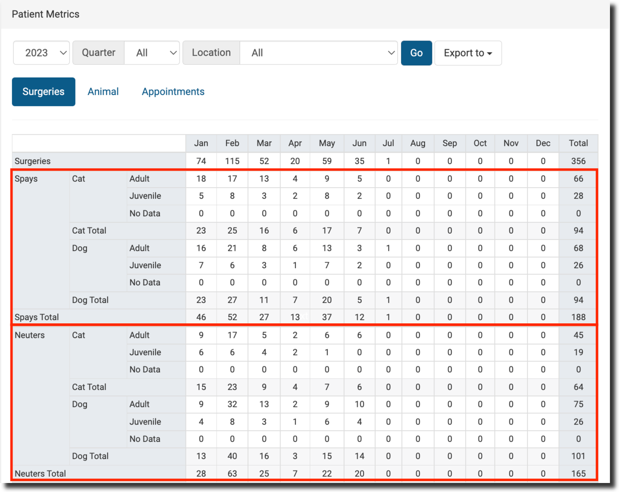 - The report is broken down into different groups and subgroups. The first line of the report tells you how many successful surgeries you had during that period of time. After that, we’ve it broken down by Surgery type (Spay/Neuter). And then it’s further broken down into Animal Species and Age.