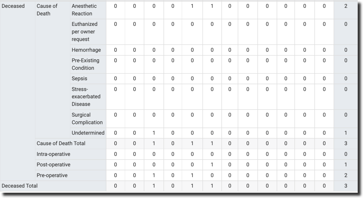 - Last, the Summary Report includes a deceased group, which is subdivided into different causes of death which will include the Euthanized by Owner Request.