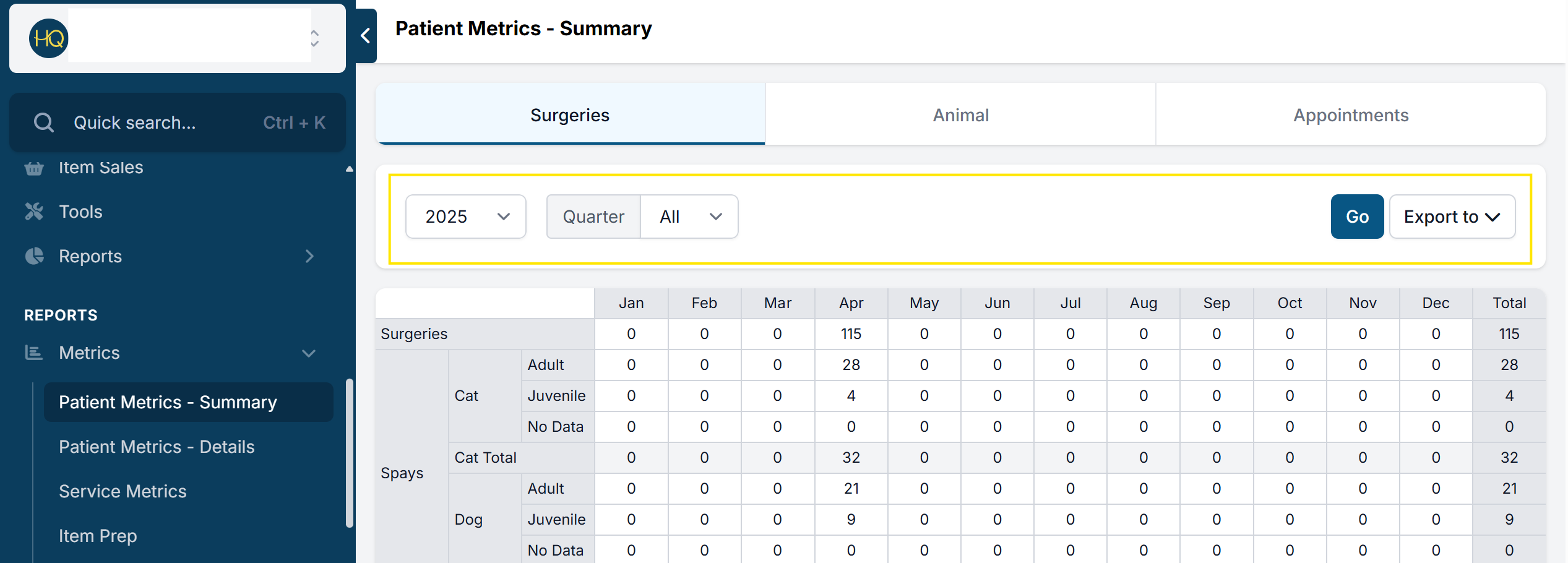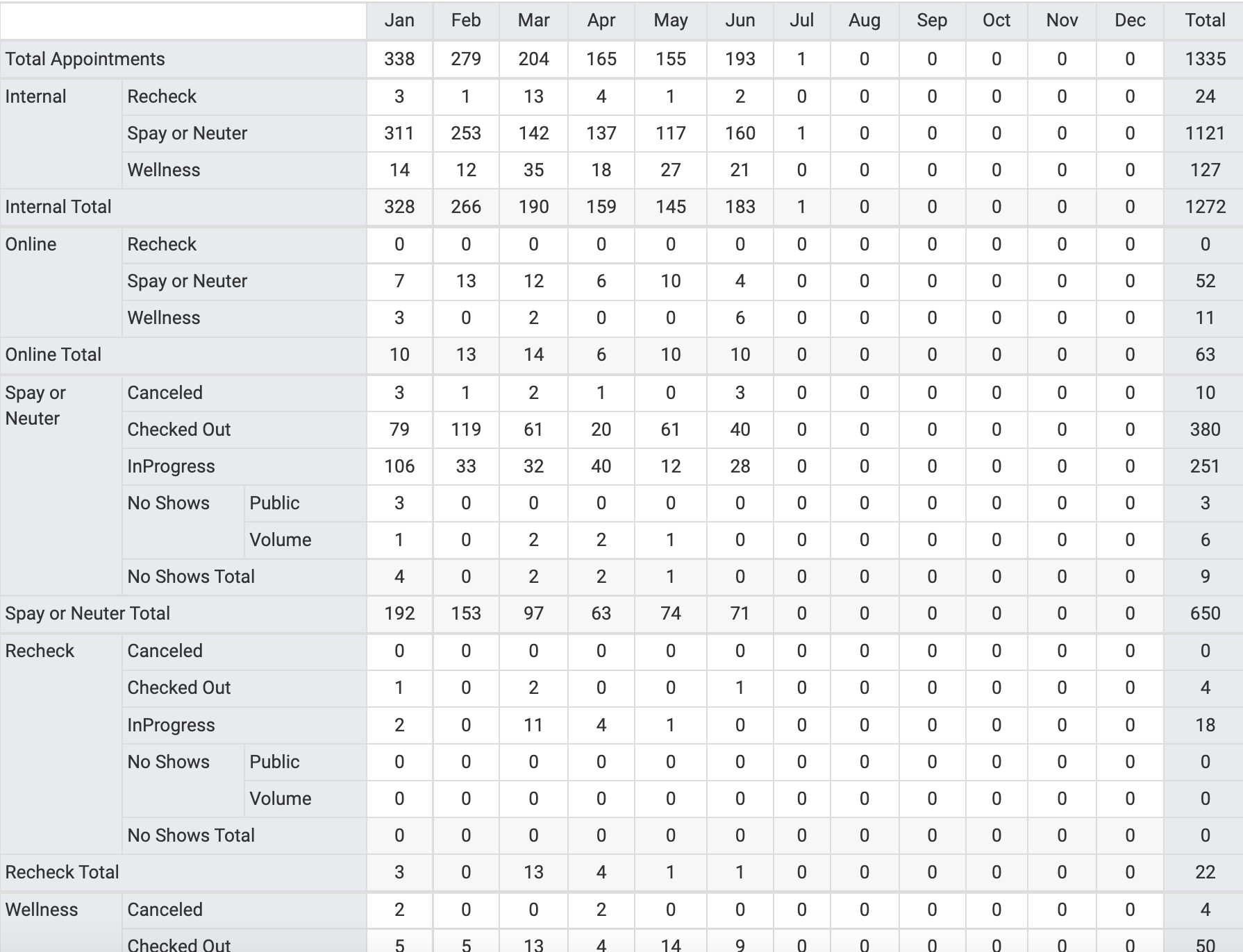 The Summary reports are where you can view details surrounding the number and types of surgeries, animals, and appointments that were scheduled at your clinic.