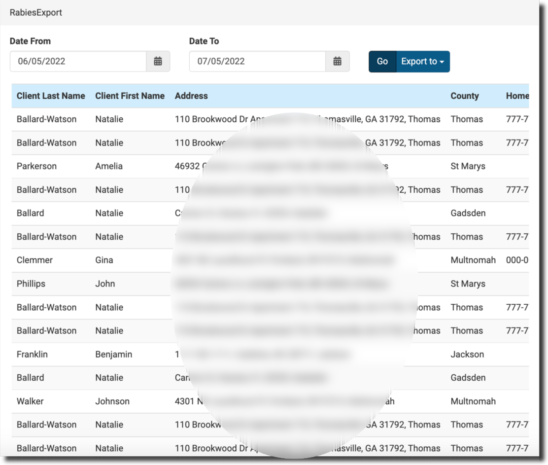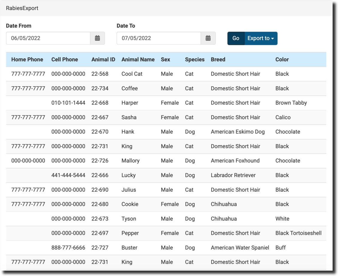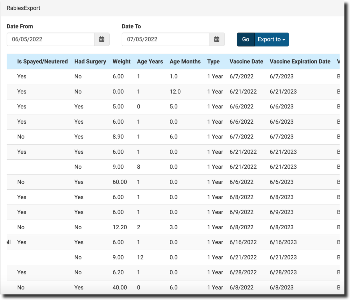 The rabies export is a record of all rabies vaccines given at your clinic and each animal's details. Some animal control, health departments, or state/county facilities will require information on all rabies vaccines administered, to who, and where that client/animal resides.