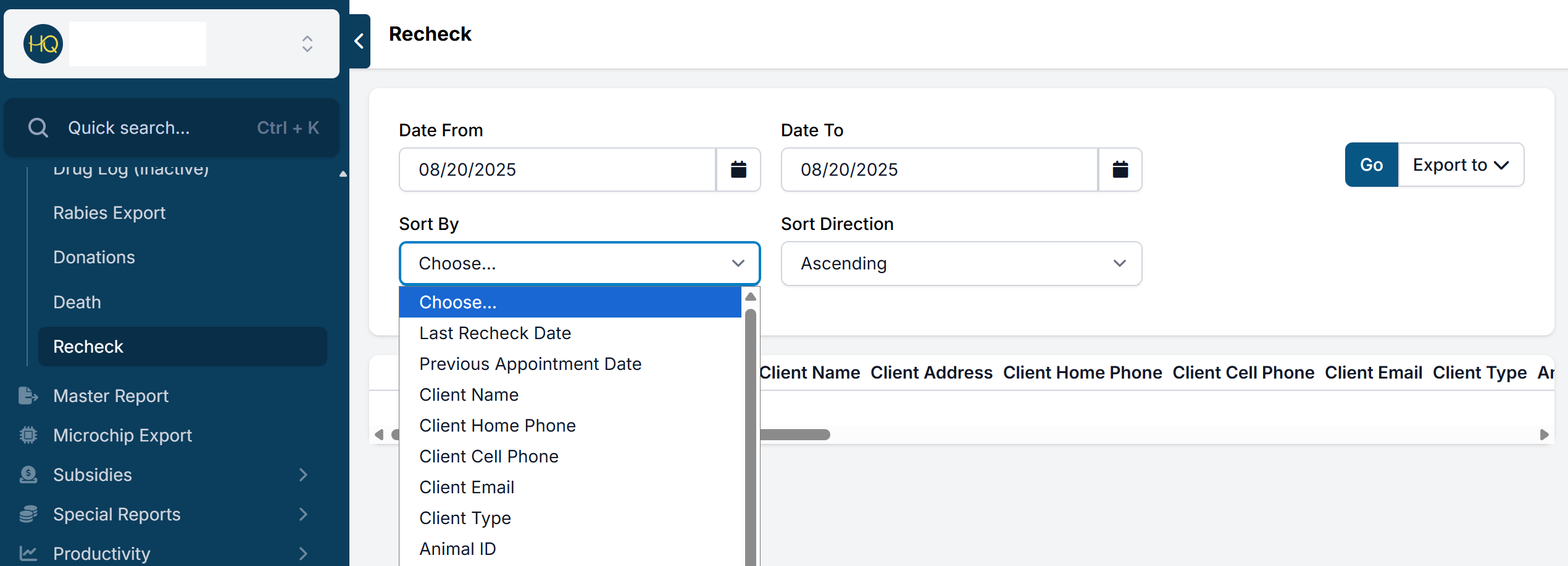 Classifying an appointment as a recheck - Rechecks in Clinic HQ are only for animals that received a spay/neuter surgery. Scheduling a Recheck appointment from the Spay/Neuter calendar provides options for reporting on the reason for the recheck.