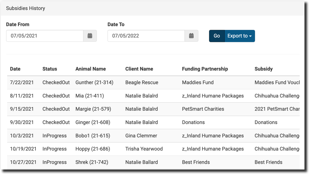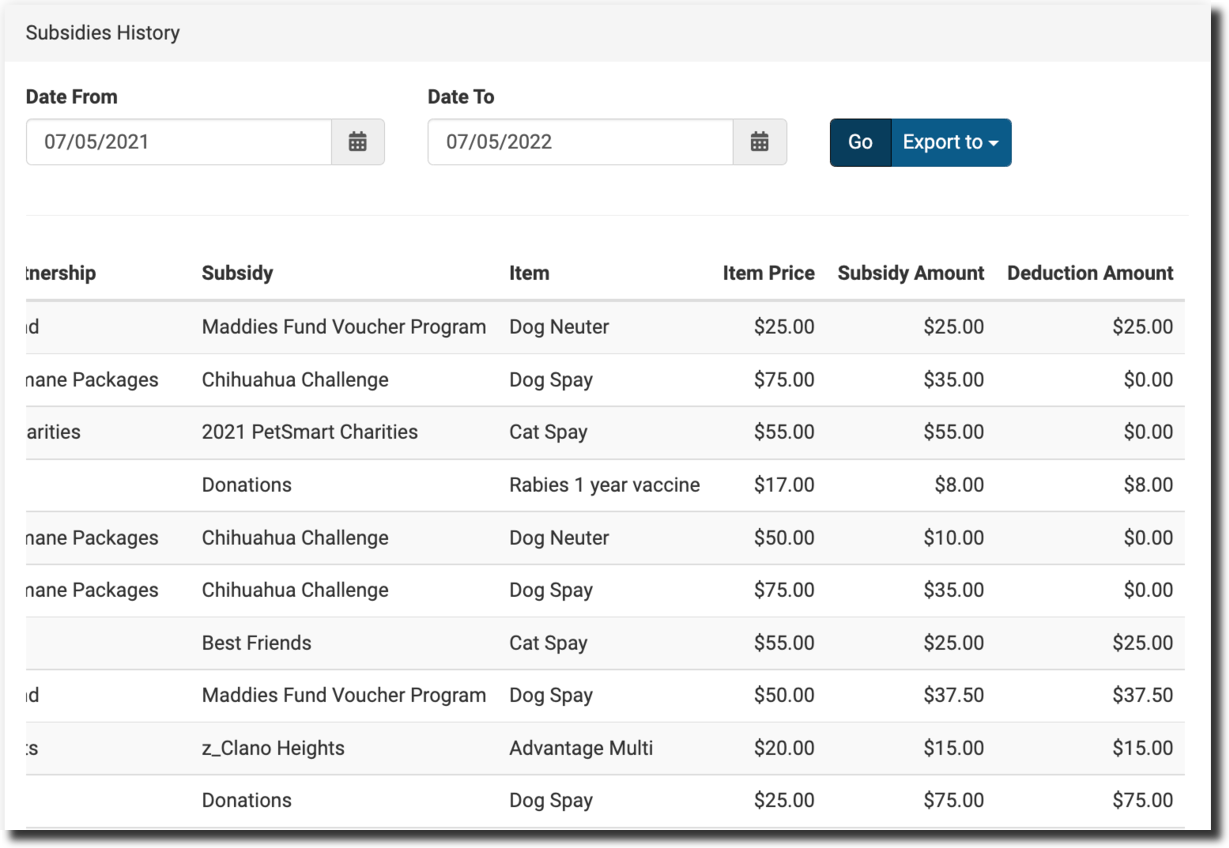 Tip: To view details associated with a specific subsidy (not all subsidies) used in your clinic, run a Custom Report.